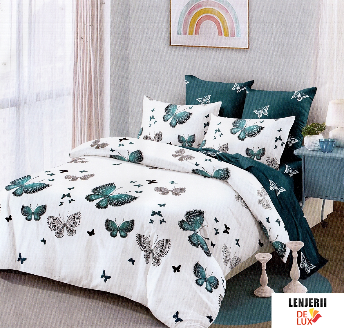PILOTA+2 PERNE+Lenjerie de pat cu elastic din finet alba cu fluturi albastri formata din 6 piese