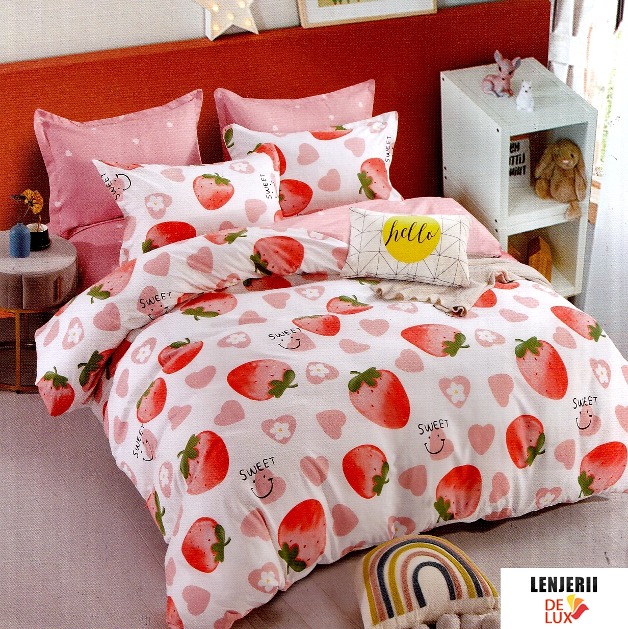 Prezentare PILOTA+2 PERNE+Lenjerie de pat din finet cu capsuni imprimate formata din 6 piese
