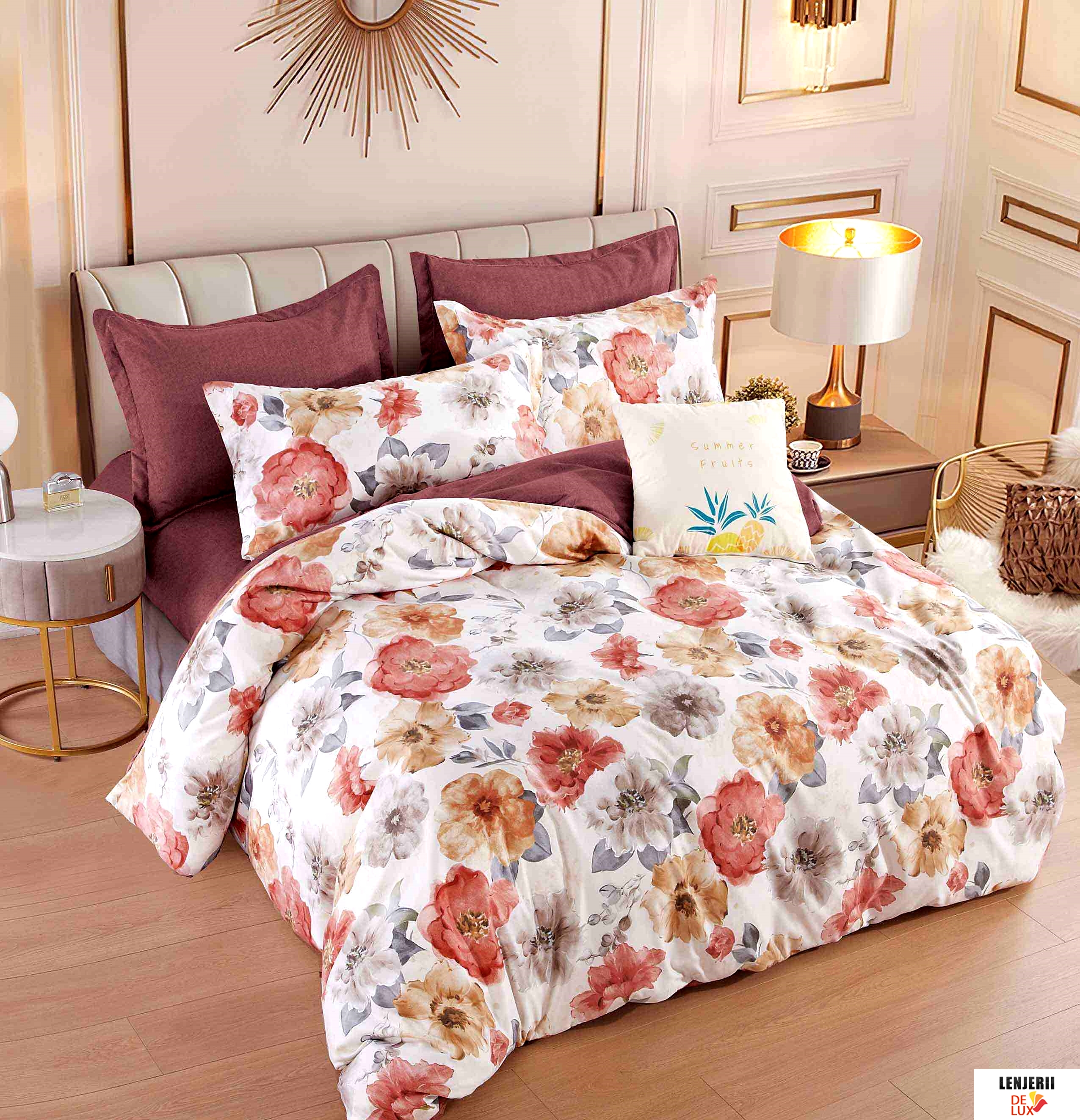 Prezentare PILOTA+2 PERNE+Lenjerie de pat din finet cu flori galbene si rosii formata din 6 piese
