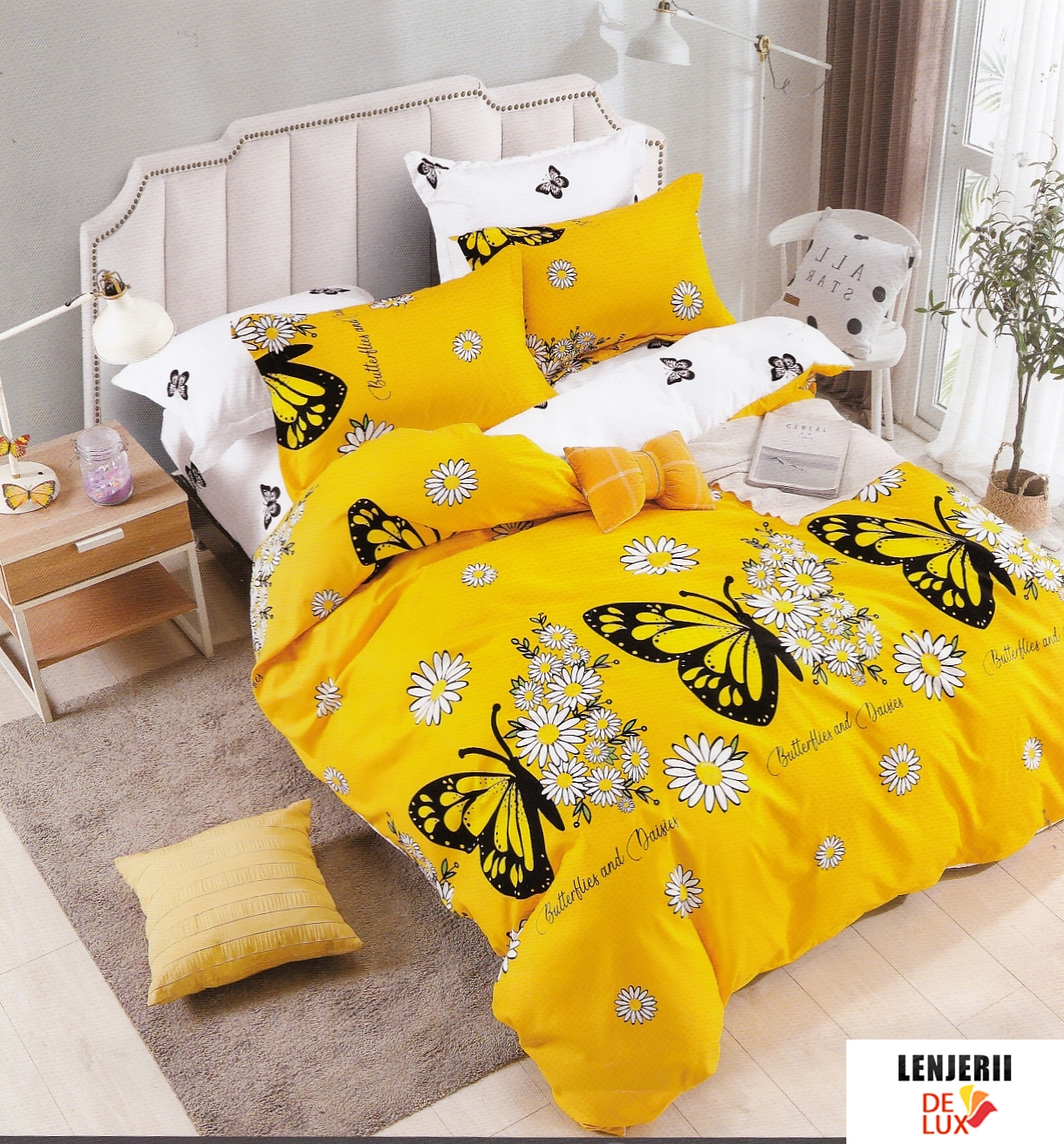 PILOTA+2 PERNE+Lenjerie de pat din finet galbena cu fluturi formata din 6 piese