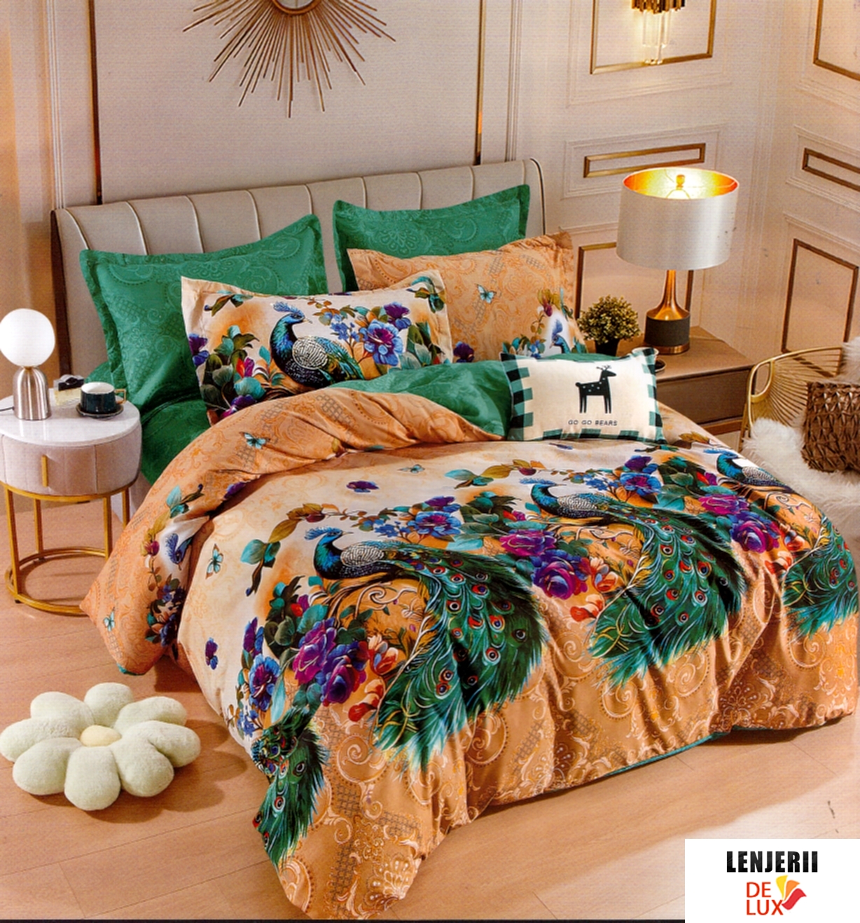 PILOTA+2 PERNE+ Lenjerie de pat din finet cu paun imprimat formata din 6 piese