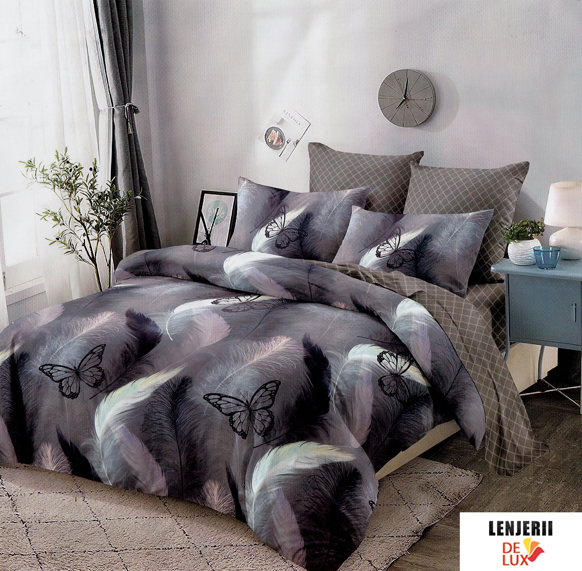 Prezentare PILOTA+2 PERNE+Lenjerie de pat din finet gri cu pene si fluturi formata din 6 piese