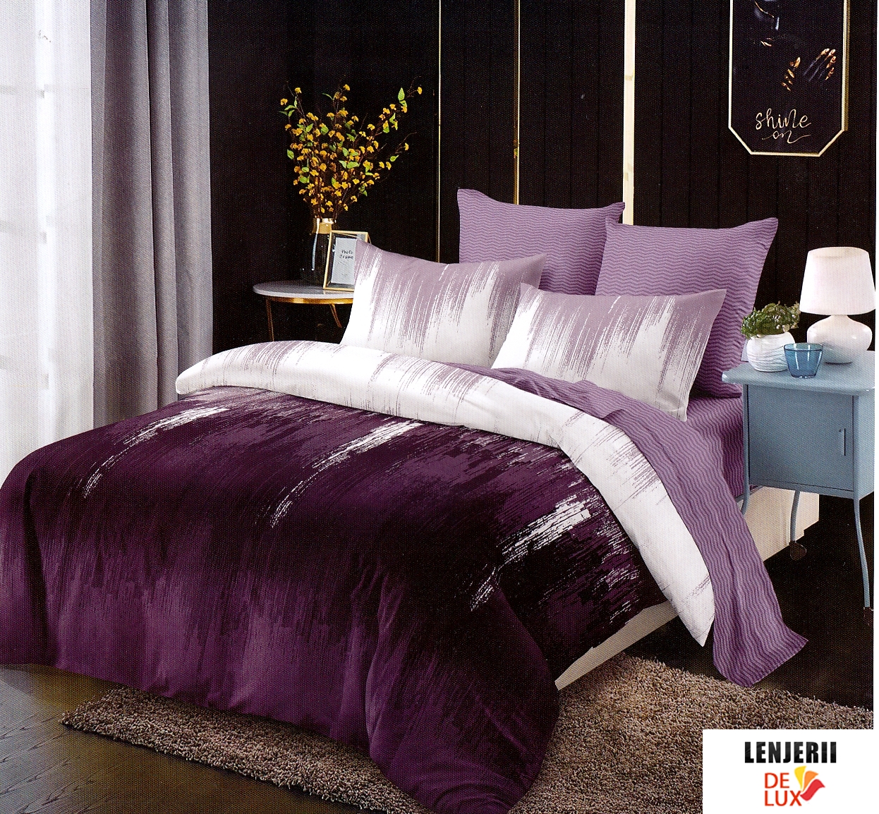 Prezentare PILOTA+2 PERNE+ Lenjerie de pat din finet mov cu alb formata din 6 piese