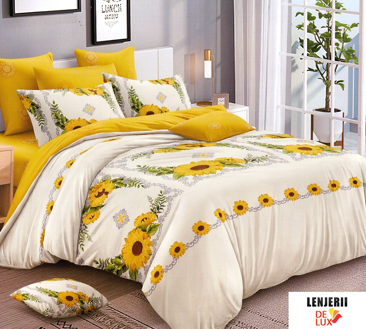 Prezentare PILOTA+2 PERNE+Lenjerie de pat din finet Pucioasa cu floarea soarelui formata din 6 piese