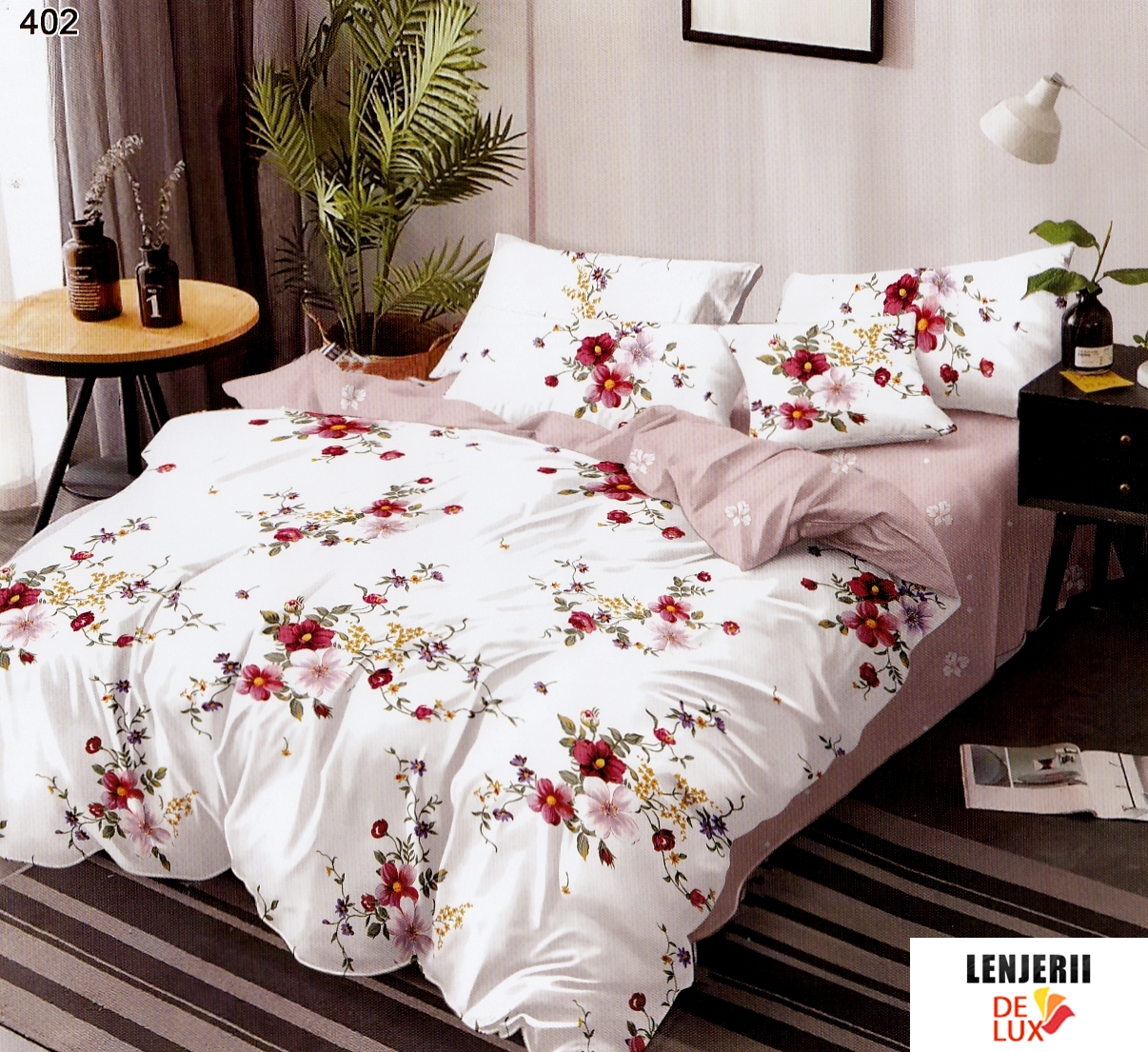 Prezentare PILOTA+2 PERNE+Lenjerie de pat din finet Pucioasa cu flori roz formata din 6 piese