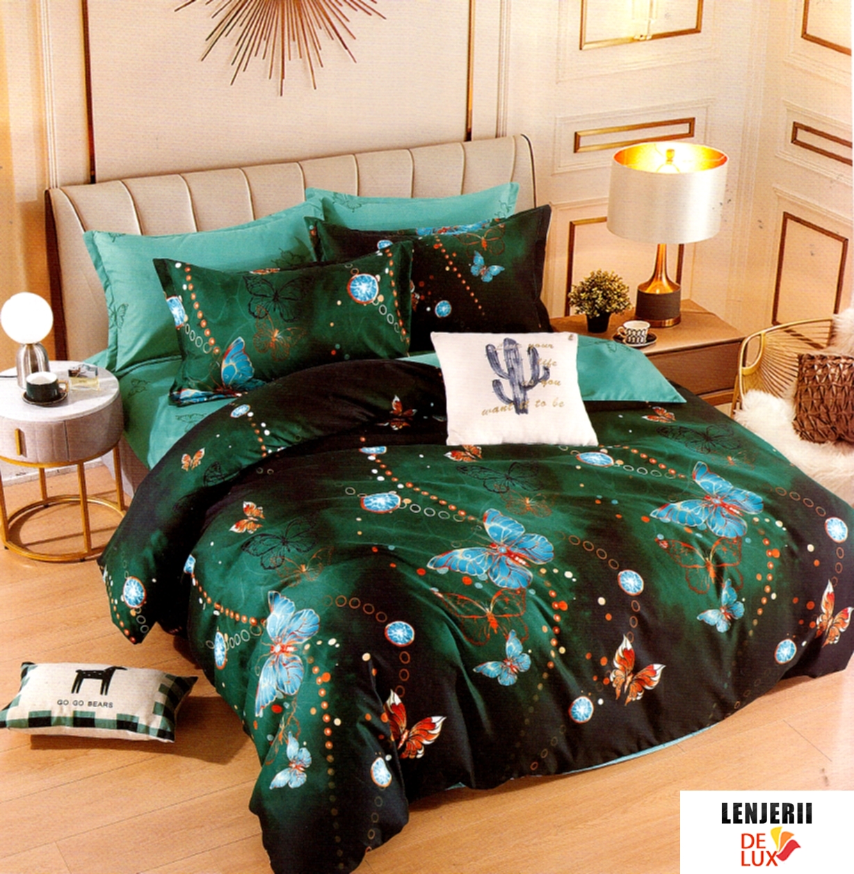 Prezentare PILOTA+2 PERNE+Lenjerie de pat din finet verde cu fluturi bleu formata din 6 piese