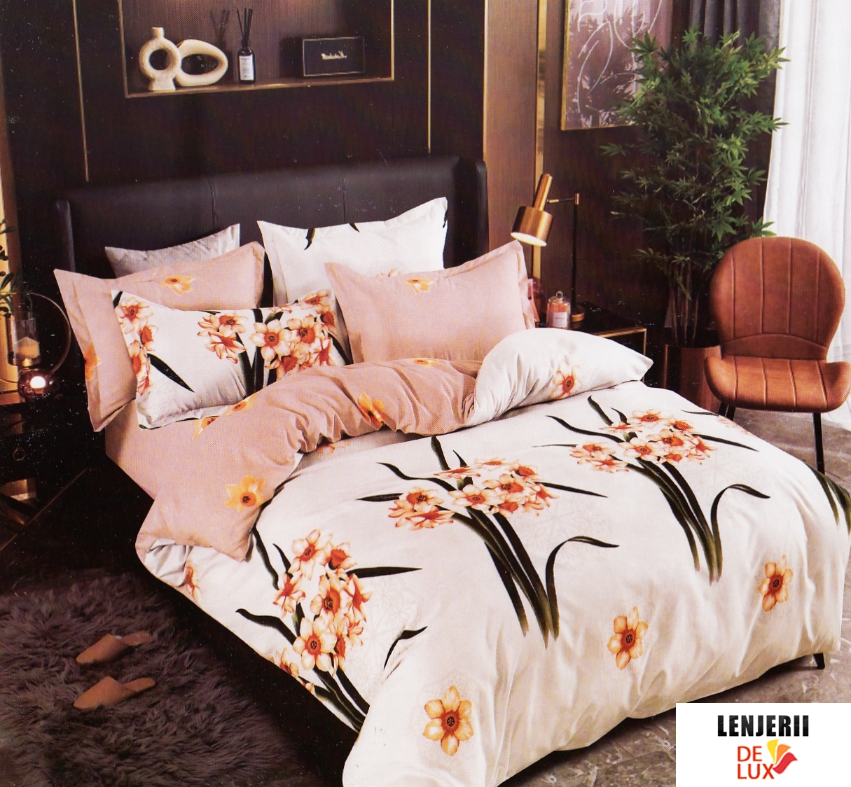 PILOTA+2 PERNE+Lenjerie de pat gri cu flori de primavara din finet Casa New Concept model 3D formata din 6 piese