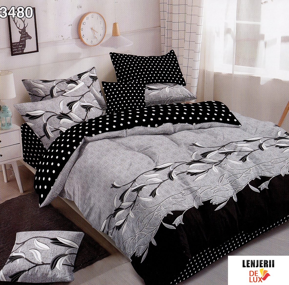 PILOTA+2 PERNE+Lenjerie de pat neagra cu gri din finet Pucioasa formata din 6 piese