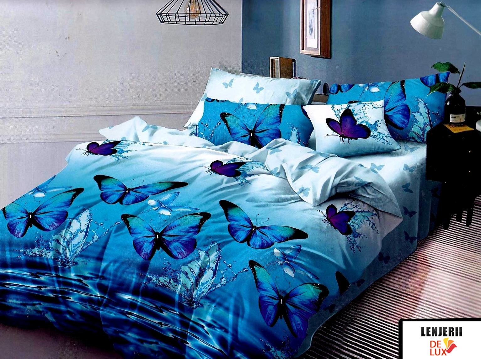 Set cuvertura pentru pat alba cu fluturasi imprimati formata din 5 piese
